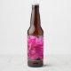 A beer bottle label featuring a photo of peonys.