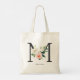 Feminine and elegant floral bridesmaid tote bag featuring watercolor illustrations of flowers, greenery monogram. Personalise by adding a name or short phrase. This letter M floral monogram canvas bag will be perfect as a personalised gift for weddings, birthdays and so much more.