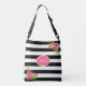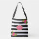Peony flowers on black & white striped crossbody bag