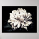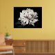 Black and white photograph of a large peony bloom against a black background. The image is ever so slightly tinted, adding subtle tones of purple to the petals.