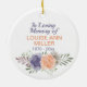 An beautiful Memorial ornament comprising of floral watercolor pale pink and purple peony roses with the quote " In loving memory of ". Makes a lovely memorial keepsake for family members. Personalise with a name and date. quote can be amended if needed. back ground colour can be added.