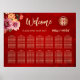 This traditional Chinese wedding seating chart features colourful Chinese flowers a gold double happiness symbol and a welcome text in an elegant handwritten script on shimmering floral red background.