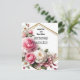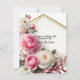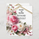 Discover an enchanting wedding invitation design adorned with a geometric wreath, highlighted by watercolor gradients of pink peonies and white roses with foliage and a soft pink ribbon bow. This floral invitation awaits your personal touch for an unforgettable celebration.