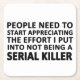 For the sarcasm lover in all of us. Check out this witty “People Really Need to Start Appreciating the Effort I Put Into Not Being a Serial Killer” design on apparel and gifts.
