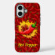 Red chilli pepper with circle of flame on removable seamless pattern background. Custom text.