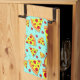 Fun turquoise blue hand towel printed all over with a red and yellow pepperoni pizza slices pattern. On the bottom right of the towel is a monogram yellow circle for you to add your own initials