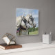 A clock with Roman numerals with portrait of a matching pair of Percheron grey draught horses at a ploughing competition, wearing harnesses with blue and red collars and blinkers, against a backdrop of fields and blue sky with fluffy clouds. Photography by ruralfrance.