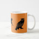 An orange mug featuring a trident, a pegasus, and an owl.