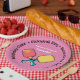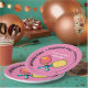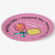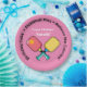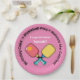 Birthday Cake + Pickleball Play = Balance the Calories! + NAME Cool pink Paper Plates with crossed pickleball paddles and yellow pickleball. Custom text and background colour