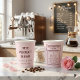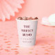 Make your coffee bar unforgettable with these charming and personalized pink paper cups! This unique two-sided design features the elegant phrase "The Perfect Blend" on the front in a chic maroon font, with your names (like Olivia & Nick) and wedding date clearly displayed. Flip the cup to reveal a delightful "Relationship Facts" section, presented in a matching frame. This side allows you to share your unique love story with your guests, detailing key moments like the years you've been together (5), your first date (Starbucks!), your shared loves (Pizza & Dogs!), and your special proposal story (100% surprise!). Fully customizable with your own names, date, and all the facts about your journey, these 8oz paper cups are perfect for wedding coffee stations, bridal showers, anniversary parties, or rehearsal dinner favors. Add a memorable and personal touch to your celebration.