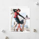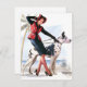 Elvgren Pin Up Girl Art. A stylish woman, wearing a red and black outfit, confidently holds the leash of a large dog on a seaside promenade. A palm tree and the ocean provide a tropical backdrop, enhancing the scene's vibrant and fashionable mood.