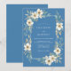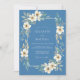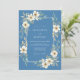 A soft watercolor design features delicate periwinkle blossoms and lush greenery encircling a refined layout. This artistic arrangement evokes a gentle, romantic mood, perfect for a special occasion. The palette centres around serene blues and creamy whites with touches of muted gold.