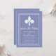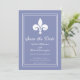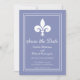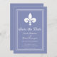 Elegant and simple Wedding save the date invite featuring a fleur de lis against a Periwinkle background. This design is a unique choice for announcing a modern wedding. Easy to customise with your wedding details. Click "Customise It" to find more personalisation options.