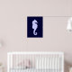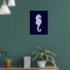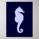 The shape of a sea horse in light periwinkle blue on a darker shade of blue.