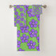 This towel set has a spring design of a field of periwinkle flowers on a green background.