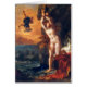 This is a reproduction of “Perseus and Andromeda” of 1853 by Eugene Delacroix. This is a classic treatment of the popular Greek Myth of Perseus coming to the rescue of the princess of Joppa, Andromeda. He was fifty-five years old in the year of this creation. He had burst upon the French artistic word two years before at the age of twenty-four with his “Barque of Dante” and became an immediate leader of the new Romantic movement. In contrast to the perfectionist Academics, Delacroix led the Romantics in the use of expressive brushstrokes being inspired by Rubens and Titan. He favored exotic scenes and emphasised colour and movement rather than clarity of line. Though hs subjects were full of passion and violence, he depicted them with a great clarifty. This painting is an oil on canvas and measures 17.24 by 12.68 inches. It is in the Staatgalerie Stuttgart, Germany.