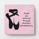 Quote says: "Goals are achieved through stubborn perseverance.". A silhouette illustration of a pair of black ballet shoes / slippers standing in the classical and contemporary ballet dancers pose up on the tips of their toes, known as en pointe. The background is pink with little white polka dots.