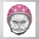 This design features a portrait of a Persian cat with a pink motorcyle helmet.