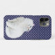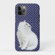 Cute Persian white cat on white pin dots and blue quilt stitch background.