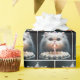A fluffy white Persian cat wearing a birthday hat with a pink tongue ready to lick cake frosting