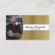 Faux brushed brass sets off the background of this business card design featuring a photo placeholder on the left with template name and title on the right. The back includes a coordinated design and colours with text fields for the business name and details. Replace the placeholder photo with your vertical format photograph and replace the QR code with yours. Fill in the template fields or click customise to select a font style, size, and colour you like.The placeholder photo is courtesy pexels.com.