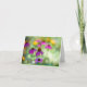 Closeup violets and yellow flowers, soft focus. insides of card left blank for personal message.