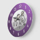 A simple round wall clock where the time circles around you or your beloved ones! Add your personal photo and this clock will transfer into a valuable item for someone you'd like to honour or surprise! The round frame is coloured purple, and digits are white. There exists 9 colour variations of this design - black, blue, pink, purple, lime, orange, white, silver and brass.