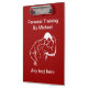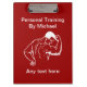 Custom personal trainer clipboards with image of a body builder on one side and a barbell on the second side, along with text you can personalise on both sides in this simple clever clipboard template. Designed for a workout gym, personal training, or fitness coach.