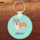 This personalised keychain makes a great small gift or stocking stuffer for Corgi owners. It features an illustration of Pembroke Welsh Corgi dog against a mint green background with your own name or short message.