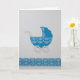 Personalise, Hand-cut cute blue baby stroller with white lace, wheels from pearls for the birth or baby shower of a baby boy on greeting card.
