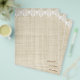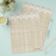 Beige, neutral parchment colour linen look background pattern design paper flyer useful for scrapbooking as well as many other uses. The top border is enhanced with a lovely, feminine white lace border that gives a beautiful vintage look. The design is on both sides of the paper, or just delete the back for plain white if no design is desired. Easily add any custom name or initial monogram or any text on the bottom right, or anywhere on the page. Note this pretty design is realistically printed on paper, and is not actual linen or lace.