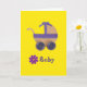 Hand-cut peach colour baby carriage with purple bow and purple ribbon and glued purple buttons on the wheels, and spring flowers and bright yellow background for the birth of a baby girl or baby boy on greeting card.