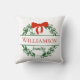 Add their name to this Personalised Family Name Christmas Throw pillow. The design is a green wreath with a red bow.
