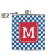 Stylish monogrammed flask featuring a blue gingham pattern. It makes a great personalised gift.