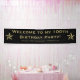 Personalise: Welcome to my 100th Birthday Party. A large black banner with gold text and templates to make it easy for you to change to your own words. One template for the large print and one for the small print. Trimmed with gold stars. For a black and gold centenarian birthday party theme.