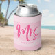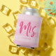 Keep your drink cans cool with this stylish can cooler featuring the word "Mrs" in pink brush script against a pink stripes pattern background. It makes a great gift for newlyweds or anniversaries. For other matching items see here https://www.zazzle.com/collections/brush_script_and_stripes-119702950275442900