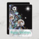 Original graphic design winter tree with glowing orbs of light and start on a black background. Add three family photos that look like christmas ornaments. Optional space for a message from you on the back. Stylish elegant christmas tree photo card in teal, pink, silver and white.
