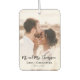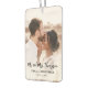 Personalised 2 Photo Newlyweds Car air freshener. Popular two-sided custom automobile air freshener with pictures of the bride and groom on their wedding day. The design features hand-lettered script font Mr and Mrs and the wedding date. On the back is the word love which can be customised to your memorable word. Great custom stuffer, contact me for matching products or help with design at truullc@gmail.com