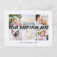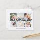 Personalised 6 family photos Universal Greetings cool Postcards featuring a stylish photo collage with 6 customised images, your greetings message in elegant handwritten script font, your name, date, year, message on the back in a modern and simple sans serif font.