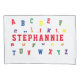 Kids Personalised Alphabet design features a white background to the alphabet in bright, colourful stencil lettering. Child's name is displayed across in red. Also available in blue. Designed to coordinate with the "ABC Baby Shower and Nursery Collection."
