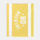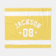 Personalised sports fleece blanket for athletes features a first or last name in curved sporty lettering along with a team number. Wide horizontal stripes and stars accent this simple and stylish design. The colour scheme of yellow and white can be modified to coordinate with your club or school colours.
