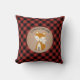 A pillow featuring a woodland themed design with an illustration of a baby fox. Personalise the name. Background is red and black buffalo plaid pattern.
