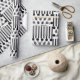 The design is of an abstract geometric artwork in black and white, along with a customisable typography field, which currently reads "Happy Birthday!" for wish, name, or other personalisation. The design allows for customisation of the background colour - if desired.