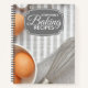 Personalised Baking Whisk Family Recipe Notebook. This design features grey stripe linen with eggs and whisk.