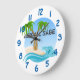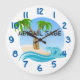 Fun Beach and Palm Trees Tropical Wall Clock. It can be personalised with a name or any text.