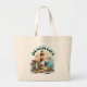 Personalised Beach Bag. Illustration of a beachy scene with lighthouse, surfboards, palm trees and dolphin.