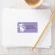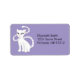 Personalised white cat label with a vector illustration depicting a beautiful female kitty with blue eyes sitting and smiling over violet background. This cute animal has fun striped tail in white and violet stripes. This feline label is great for girl who has and loves her white kitty and for cat lovers as myself.