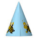Customisable Party Hat with illustration of flying bee, with custom text template for your name or message, illustration by MaxiHarmony / Radka Kavalcova