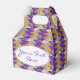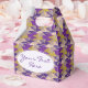 Graphic birds seamless pattern. Tesselation with cute birds in blue purple and golden tones. Customisable favour box. You can easily change size position of the design (scaling) and add your own text for many occasions.