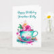 Grandma's birthday card. Graphics of a watercolor illustration of a pretty turquoise and teal vintage tea or coffee cup full or pink and orange flowers.